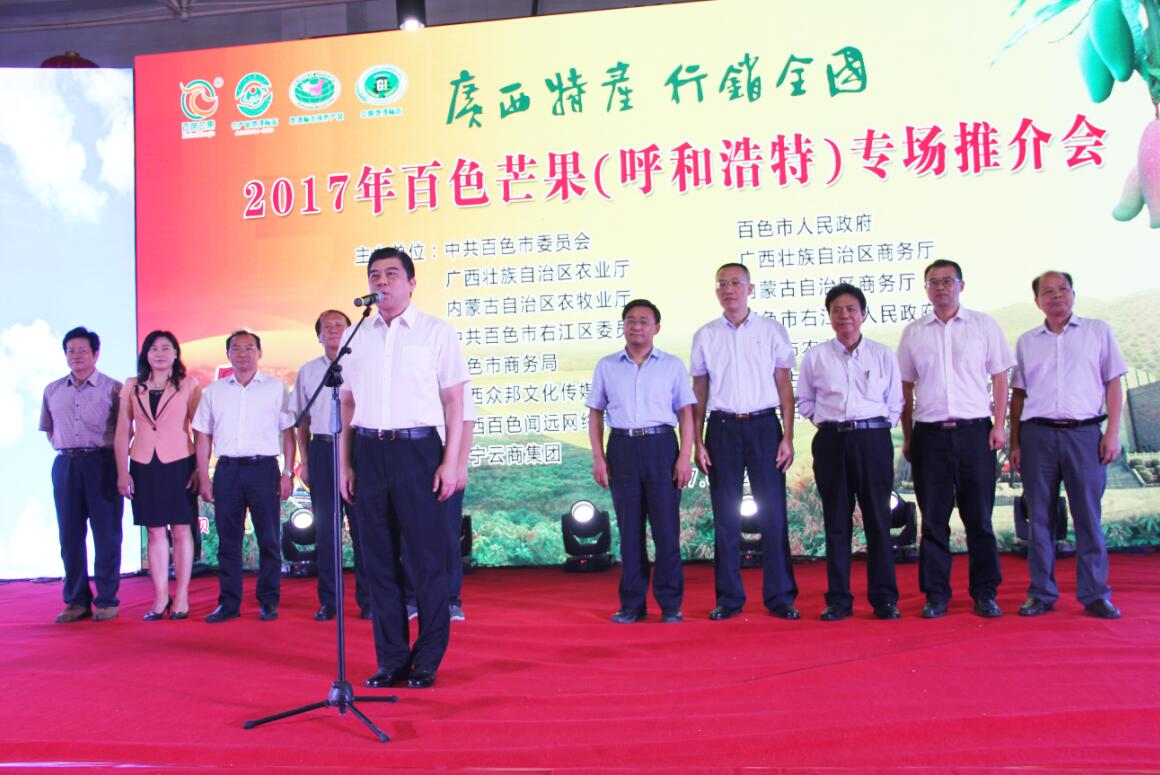 7月27日上午,由中共百色市委員會(huì)、百色市人民政府、內(nèi)蒙古自治區(qū)農(nóng)牧業(yè)廳、內(nèi)蒙古自治區(qū)商務(wù)廳、廣西壯族自治區(qū)商務(wù)廳、廣西壯族自治區(qū)農(nóng)業(yè)廳主辦的2017年百色芒果專場(chǎng)推介會(huì)在協(xié)會(huì)會(huì)員單位、內(nèi)蒙古食全食美集團(tuán)美通食品批發(fā)市場(chǎng)內(nèi)蒙古農(nóng)畜產(chǎn)品展銷大廳舉行。百色市委副書(shū)記、統(tǒng)戰(zhàn)部部長(zhǎng)楊春庭在推介會(huì)上宣布活動(dòng)正式啟動(dòng),內(nèi)蒙古自治區(qū)農(nóng)牧業(yè)廳副廳長(zhǎng)劉永志、百色市政協(xié)副主席韋曉東等領(lǐng)導(dǎo)出席推介會(huì),有關(guān)特邀嘉賓、百色市、縣有關(guān)部門(mén)代表、內(nèi)蒙古自治區(qū)有關(guān)部門(mén)、呼和浩特市有關(guān)部門(mén)負(fù)責(zé)人、客商代表、新聞媒體等參加會(huì)議。