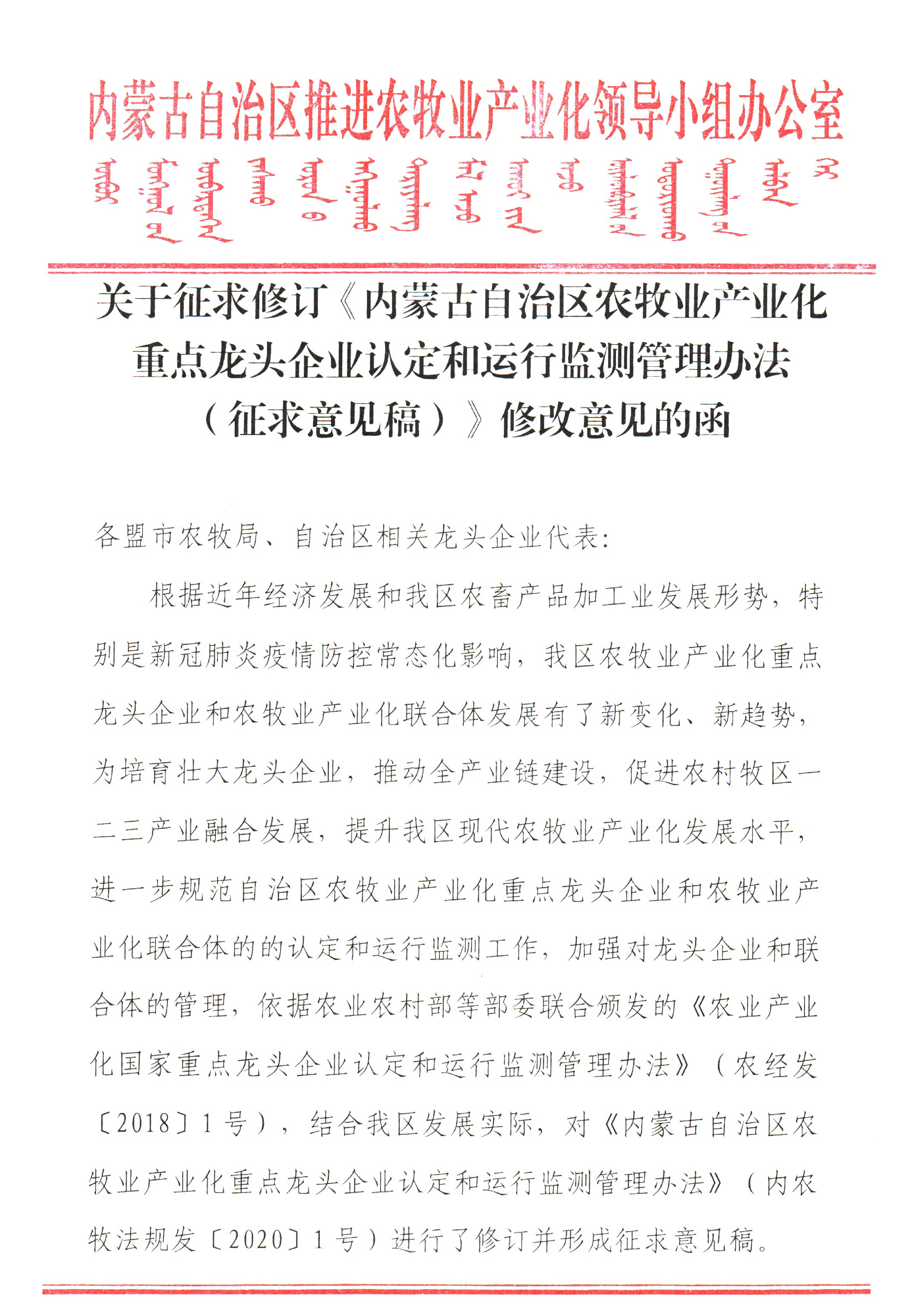 標(biāo)題:關(guān)于征求修訂《內(nèi)蒙古自治區(qū)農(nóng)牧業(yè)產(chǎn)業(yè)化重點龍頭企業(yè)認(rèn)定和運行監(jiān)測管理辦法(征求意見稿)》修改意見的函