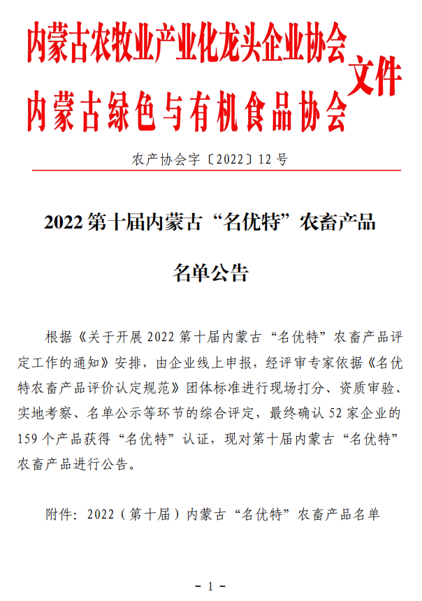 標題:2022第十屆內蒙古“名優(yōu)特”農畜產品名單公告