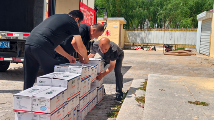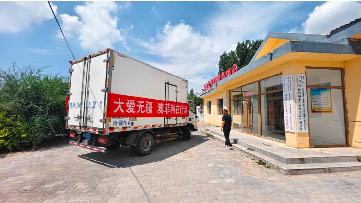 捐贈(zèng)現(xiàn)場(chǎng),一輛懸掛“大愛(ài)無(wú)疆 澳菲利在行動(dòng)”紅色條幅的冷鏈車緩緩駛?cè)胩缀f?zhèn)永生村村委會(huì),車剛停穩(wěn),工作人員迅速將一箱箱羊肉產(chǎn)品搬下車,整齊碼放在村委會(huì)門口,現(xiàn)場(chǎng)暖意涌動(dòng)。