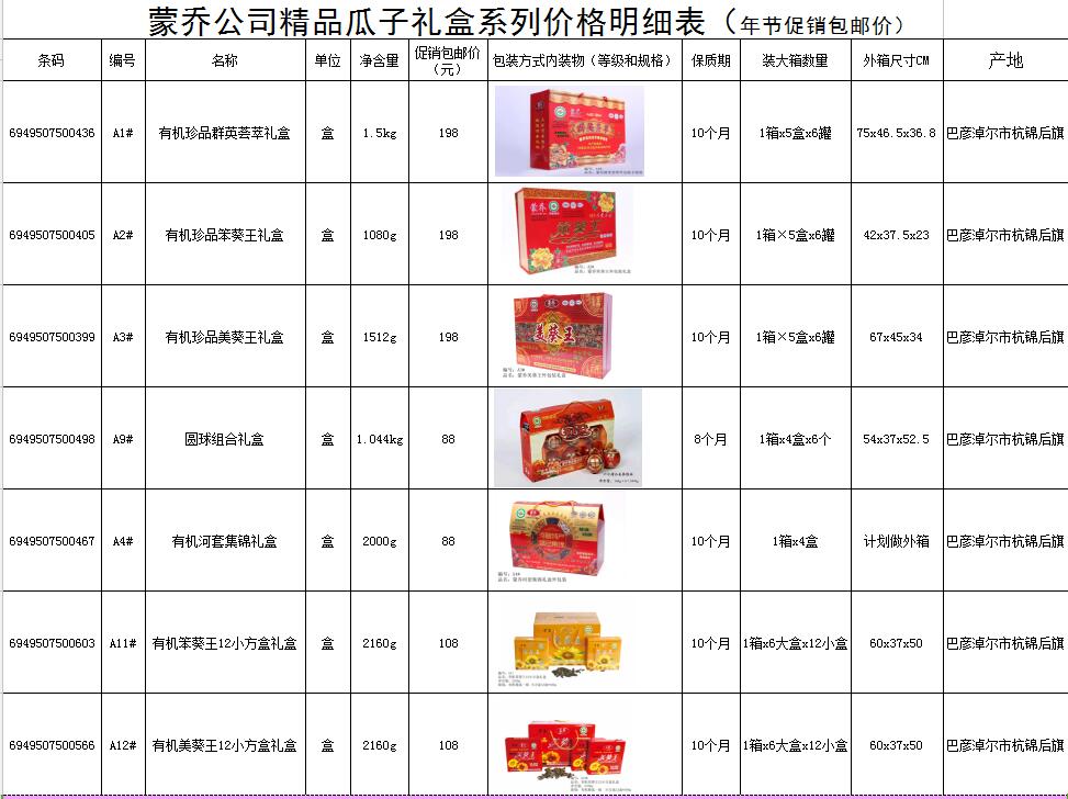 呼市鄂爾多斯大街石羊橋十字路西移動(dòng)大廳西20米北巷,現(xiàn)有大量年節(jié)禮品盒:巴盟有機(jī)葵花子禮盒低價(jià)促銷(xiāo)包郵,聯(lián)系電話:15334782928,十盒包郵,價(jià)格如下: