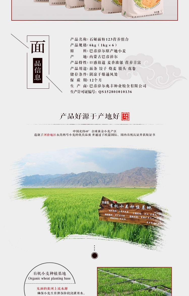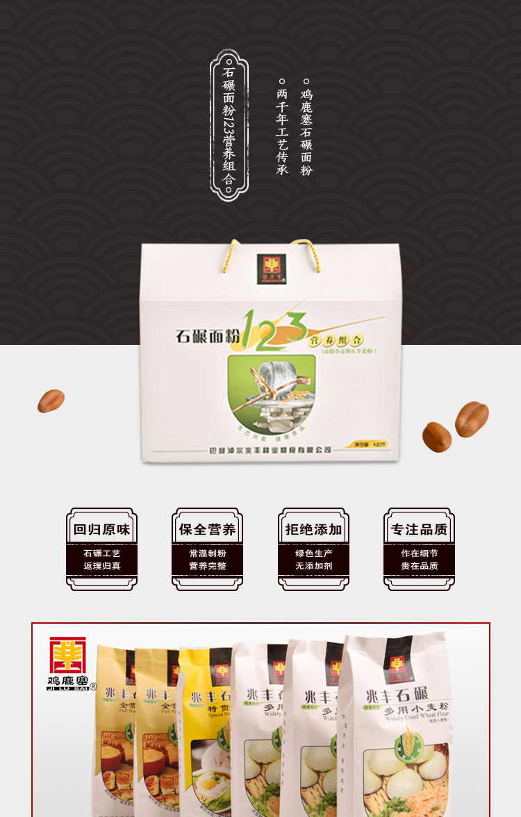 產品名稱:雞鹿塞 石碾面粉123營養(yǎng)組合 禮盒 6kg 河套高筋面粉 禮盒