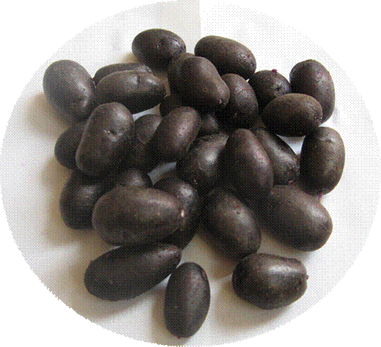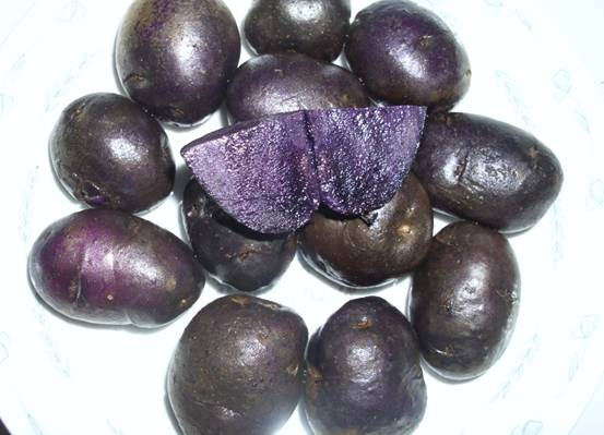 黑美人經(jīng)甘肅省農(nóng)業(yè)科學(xué)院農(nóng)業(yè)測試中心檢測(NO.R41-AP-2006)測定淀粉含量12%,每千克黑美人中含粗淀粉119.7克,還原糖3.49克,每百克黑美人中含蛋白質(zhì)2.45克,脂肪0.1克,每百克黑美人中微量元素及維生素含量為:碳水化合物16.5克,維生素C21.7毫克。其黑紫色的原因是富含Delphindin(紫色)花青素,經(jīng)北京譜尼理化分析測試中心檢測(檢測報告編號為:SH061204-014)其花青素含量為每百克4.28毫克。該品種除營養(yǎng)豐富外,其富含的花青素還具有抗癌、抗衰老、美容和防止高血壓等多種保健作用