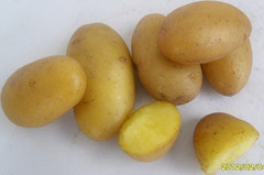 FAVORITA(費(fèi)烏瑞它)1981年由國(guó)家農(nóng)業(yè)部種子局從荷蘭引入,山東省農(nóng)業(yè)科學(xué)院蔬菜花卉所引入山東栽培,取名“魯引1號(hào)”,1989年天津市農(nóng)業(yè)科學(xué)院蔬菜花卉所引入,取名“津引8號(hào)”,又名“荷蘭薯”、“荷蘭七號(hào)”、“荷蘭15”,為我國(guó)主栽早熟品種之一,該品種出苗后60—70天即可收獲。 [特征特性]該品種早熟,株型直立,株高約60cm左右,莖桿粗壯,分枝少,葉片肥大,葉緣波狀,花淡紫色;結(jié)薯集中,薯塊膨大迅速,長(zhǎng)橢圓形,芽眼淺,黃皮黃肉,表皮光滑,食味好,適合加工和出口創(chuàng)匯,在香港及東南亞各國(guó)極為暢銷(xiāo);抗馬鈴薯Y病毒,對(duì)A病毒免疫;淀粉12.4%—14%,還原糖0.03%。植株易感晚疫病。塊莖感晚疫病和環(huán)腐病。輕感青枯病、退化快。產(chǎn)量高,畝產(chǎn)2000kg,高產(chǎn)可達(dá)3000kg以上。 [適宜范圍]該品種適宜性較廣,黑龍、遼寧、內(nèi)蒙古、河北、北京、山東、江蘇、廣東、廣西、貴州、四川等地均有種植,是適宜出口的品種。