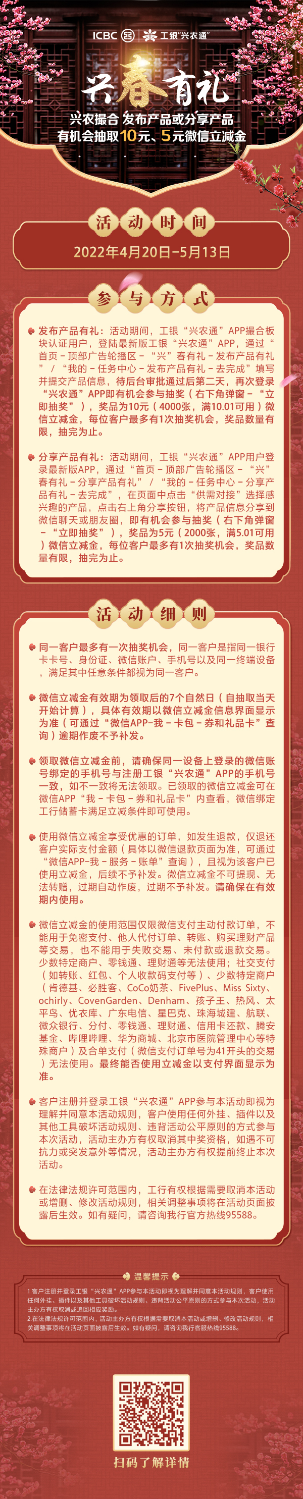 近期,“興農(nóng)撮合”平臺(tái)正式入駐工銀“興農(nóng)通”APP,還上線了“興”春有禮營(yíng)銷活動(dòng)。入駐平臺(tái)后,發(fā)布并分享產(chǎn)品,最高有機(jī)會(huì)獲得15元微信立減金!詳情可參考下方長(zhǎng)圖: